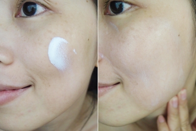 全臉均勻的塗上修護隔離乳,剛擦上時會感覺有點油油的光亮感,但在完全吸收後臉部的輕微黏膩感就會消失,接著再上後續的彩妝,簡單的防曬隔離後就能輕鬆面對紫外線。