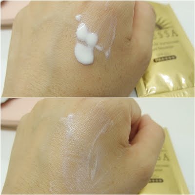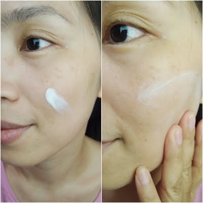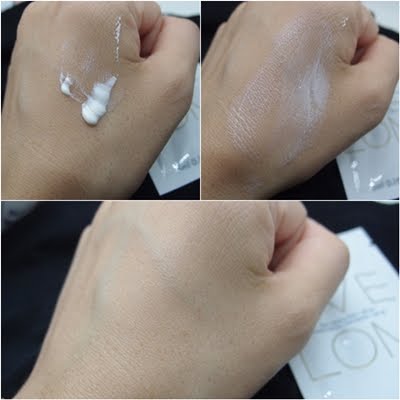 防護乳為白色乳液質地,質地輕盈,肌膚上易於推勻。