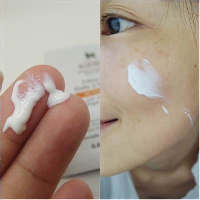 乳液般的質地,塗抹在臉上卻不會有悶熱的厚重感,就像是平時擦的保養乳液一般,只是差別是這是具有SPF50以上的防曬功能,台灣悶熱的夏天也能安心的使用,肌膚完全不會覺得黏膩,反而是有保濕感。