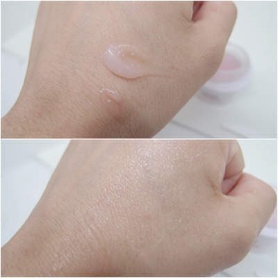 先在手背上試擦密集修護水面膜,淡粉紅色的凝凍狀水面膜,有著淡淡的花香氣,水面膜裡的白白細微顆粒是包覆維他命E的微膠囊,把維他命E包起來保持最高活性,即效修護肌膚。