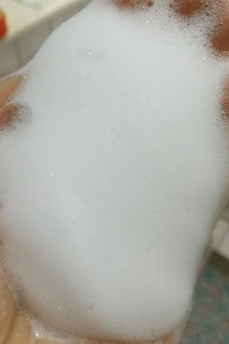 先將頭髮打濕,以起泡杯將洋甘菊舒緩洗髮乳打出豐富的泡沫。