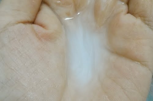 倒出適量洋甘菊舒緩洗髮乳是白色的乳液狀,有著洋甘菊的幽香,以草本概念的成分有:沒藥醇(是由洋甘菊中萃取出來的成分,沒藥醇有鎮靜舒緩、芳香的功效)、菸鹼胺(菸鹼酸之胺基化合物,維生素B3的衍生物,則是用來維持肌膚的含水量)。