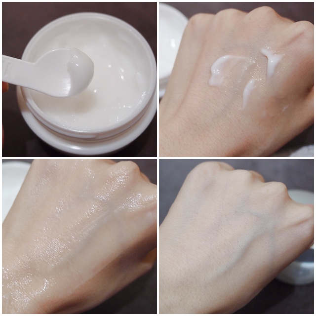 白色凝霜狀質地,是無添加香精的,單就外型看就像是悶熱夏天時適合的清爽保濕霜一般,光是擦在手背上就可以知道水凝霜是挺保濕的,喜歡的是塗抹在手背上的感覺是很清爽、不油膩的,但也別小看了這瓶美白水凝霜,可是除了保濕成分外,還有美白的成分,光是試在手背上就可以看到美白水凝霜呈現出的白潤透嫩感!