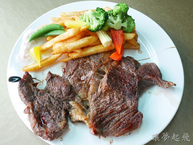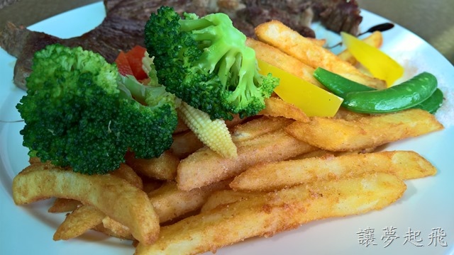 除了牛排以外,還有甜椒、玉米筍、花椰菜以及份量不少的薯條