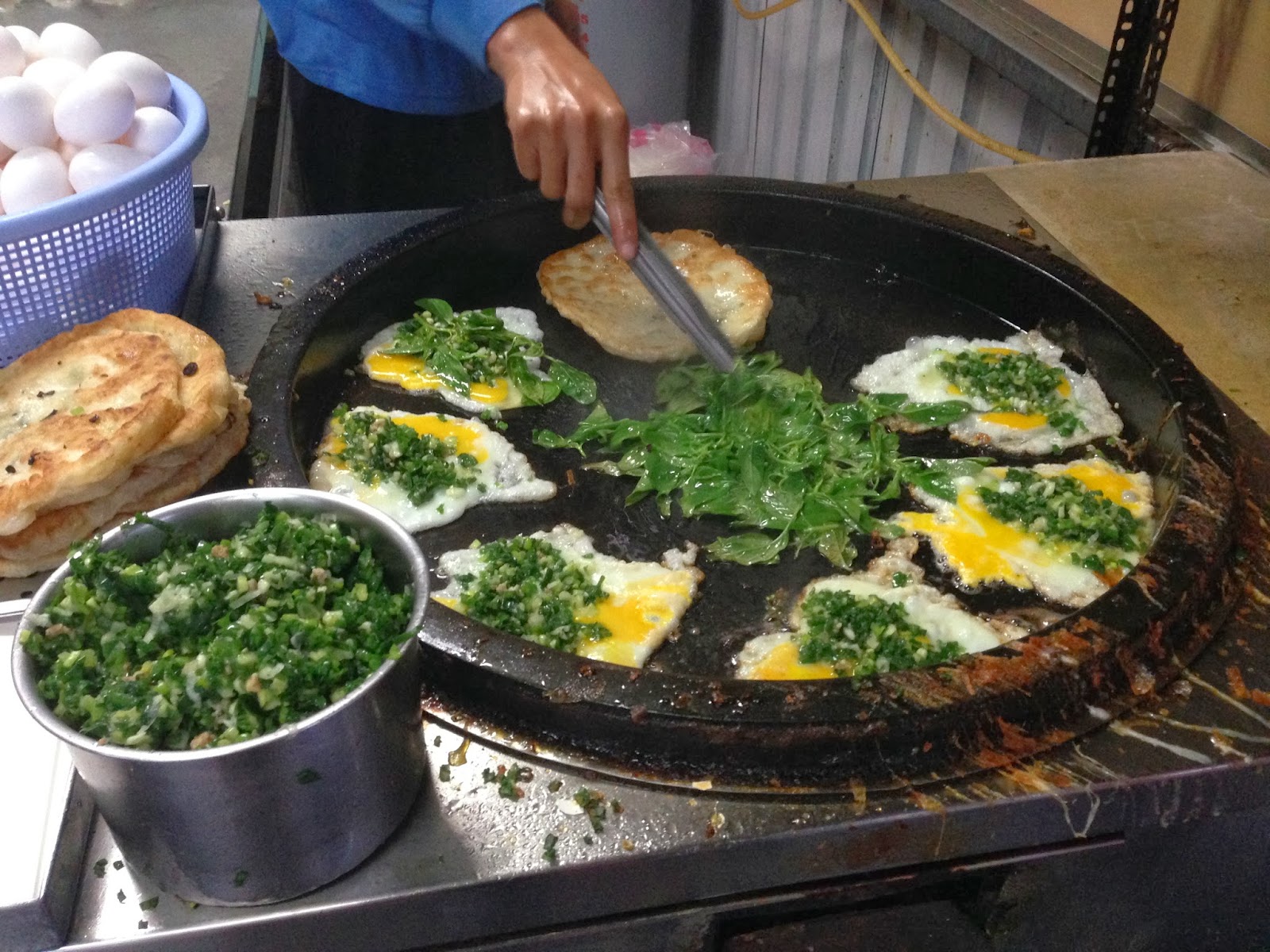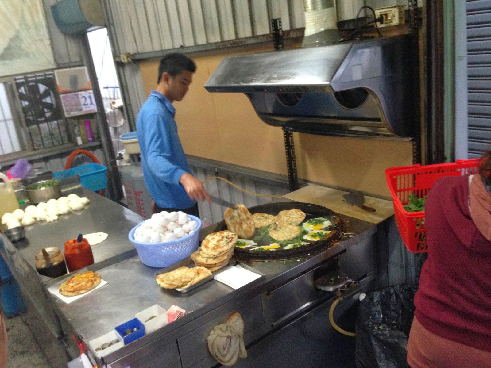 沒錯,重點來了,請看個仔細,左邊這個桶子中的蔥末加上鍋子中間正在爆香的九層塔就是美味的關鍵,你有看過蔥油餅的蔥不但加在餅皮中,還在額外加那麼一大坨的嘛!!!!是想逼死誰啊!還有那間的酥香的蛋蛋!my god!!!!最後在加了爆香的九層塔.......這種味覺的衝擊,誰有自信能夠泰山崩於前還不動聲色的呢???