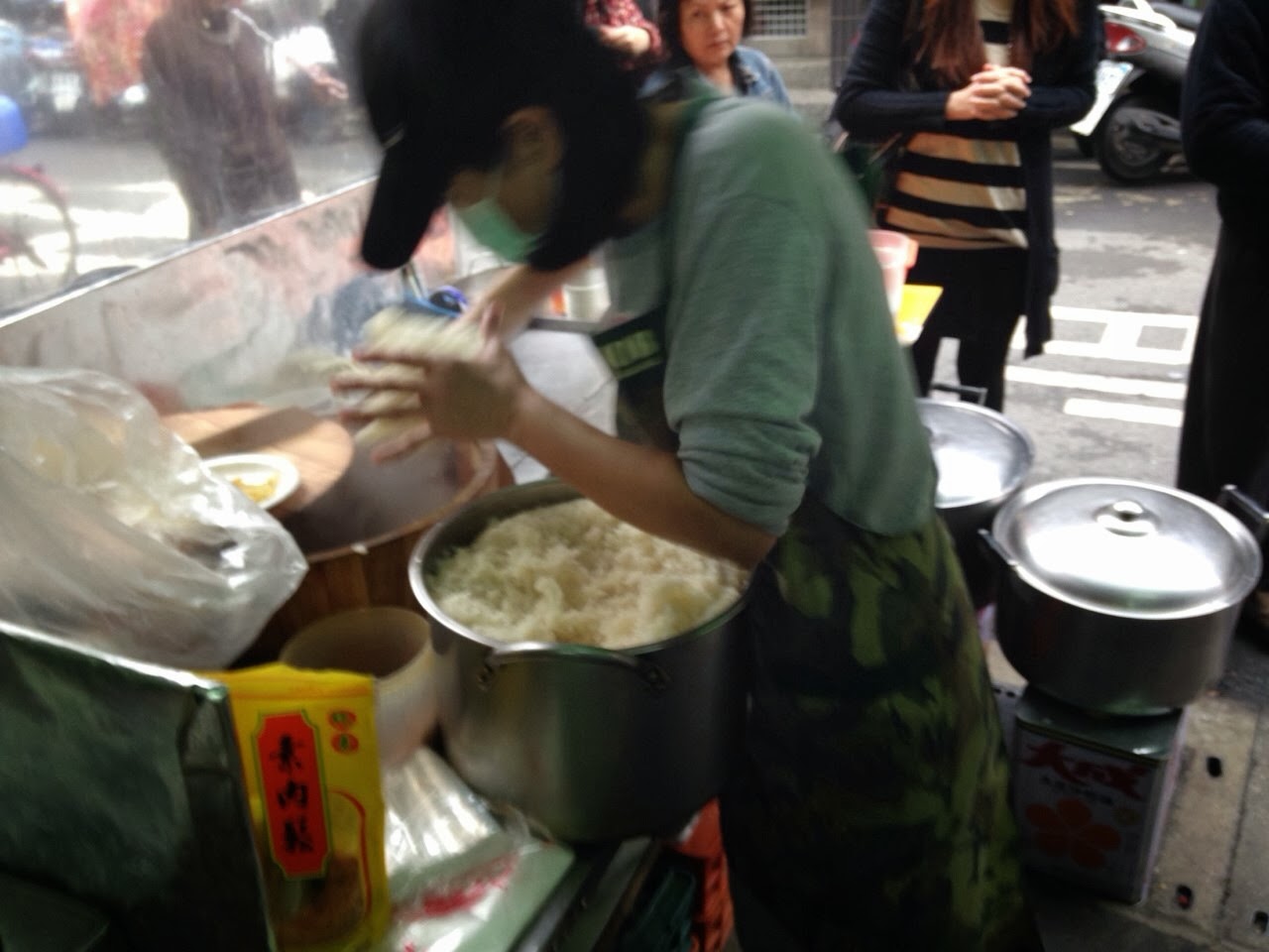 這是在做飯糰和放花生湯的工作檯,香噴噴的糯米一整鍋剛煮好,配上老闆娘有勁的捏出一個個飯糰,看起來就格外的好吃,可惜老寶這次沒點到,下次一定要來點一下吃看看!!!