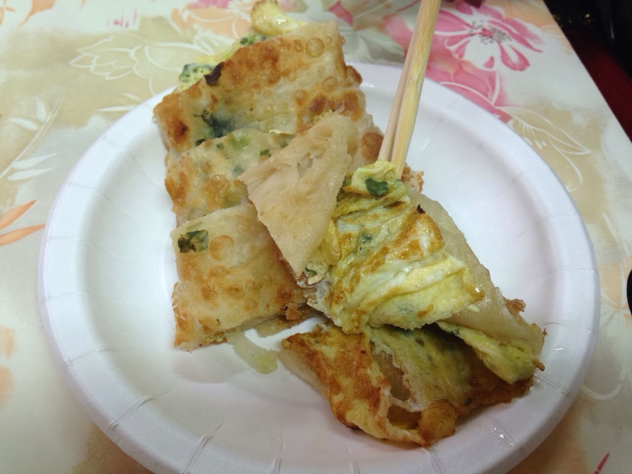 主角蛋餅上場囉!!!老闆用現擀現煎的類似蔥油餅口感的餅皮,換句話說也可以說是蔥油餅加蛋的感覺,煎的恰恰的蛋餅皮,加上柔嫩的蔥花蛋!!!阿斯