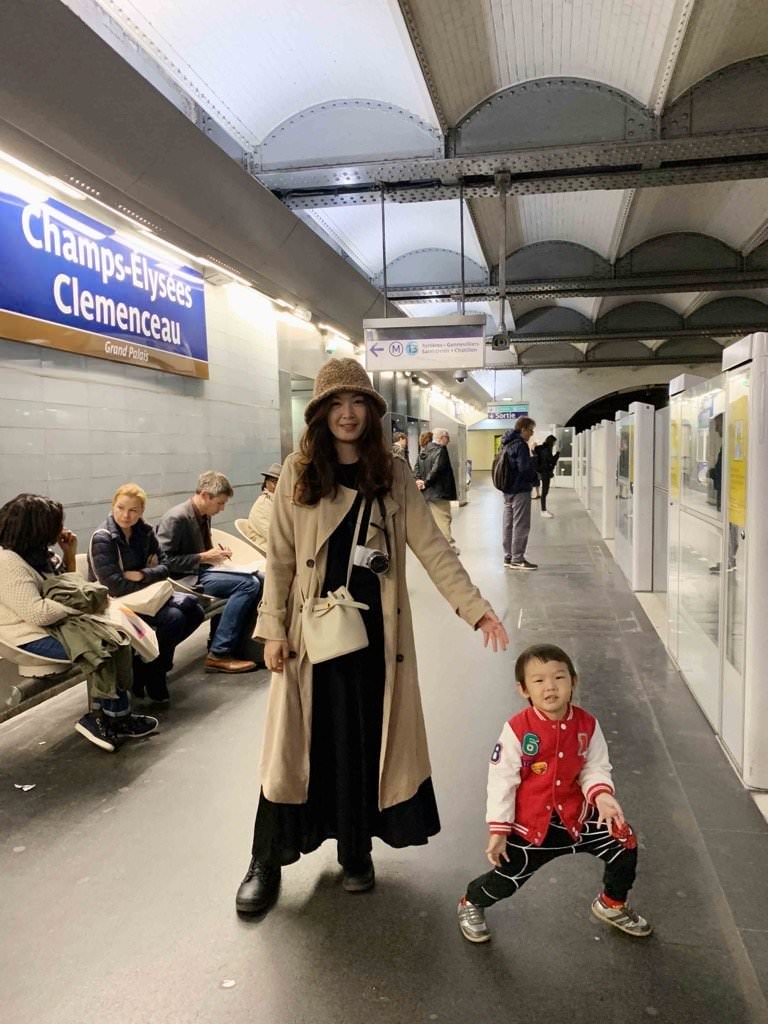 ▼ 第一天買了這個包之後就開始背,之後的巴黎與米蘭行程幾乎都背著這咖,下圖是帶著可愛小屁孩坐地鐵要在香榭麗舍-克列蒙梭站轉車