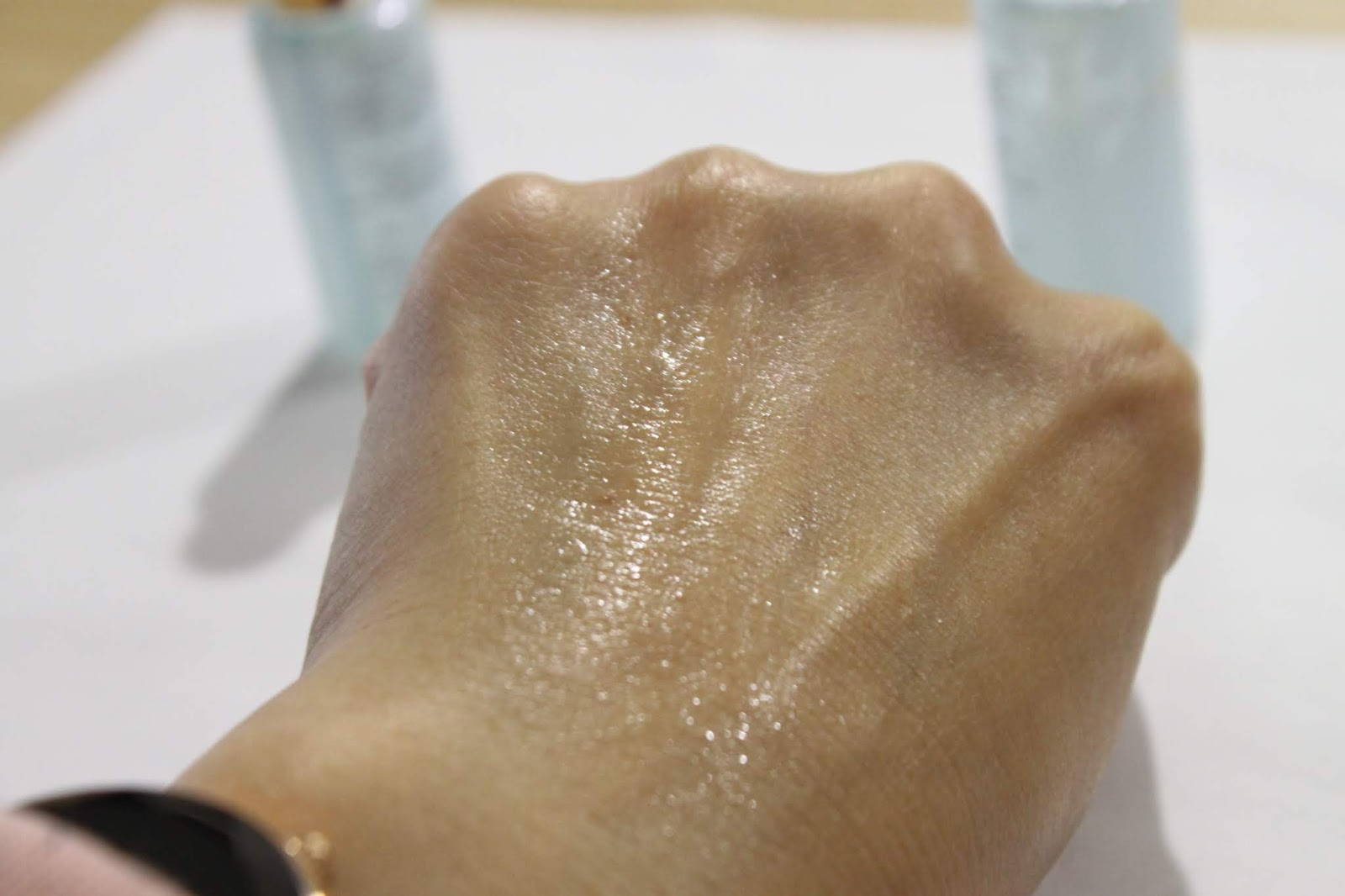 均勻推開後不黏膩的觸感,可以明顯的感覺到皮膚像喝飽了水一樣