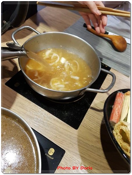 接著再倒入高湯,石頭火鍋湯底就完成了
