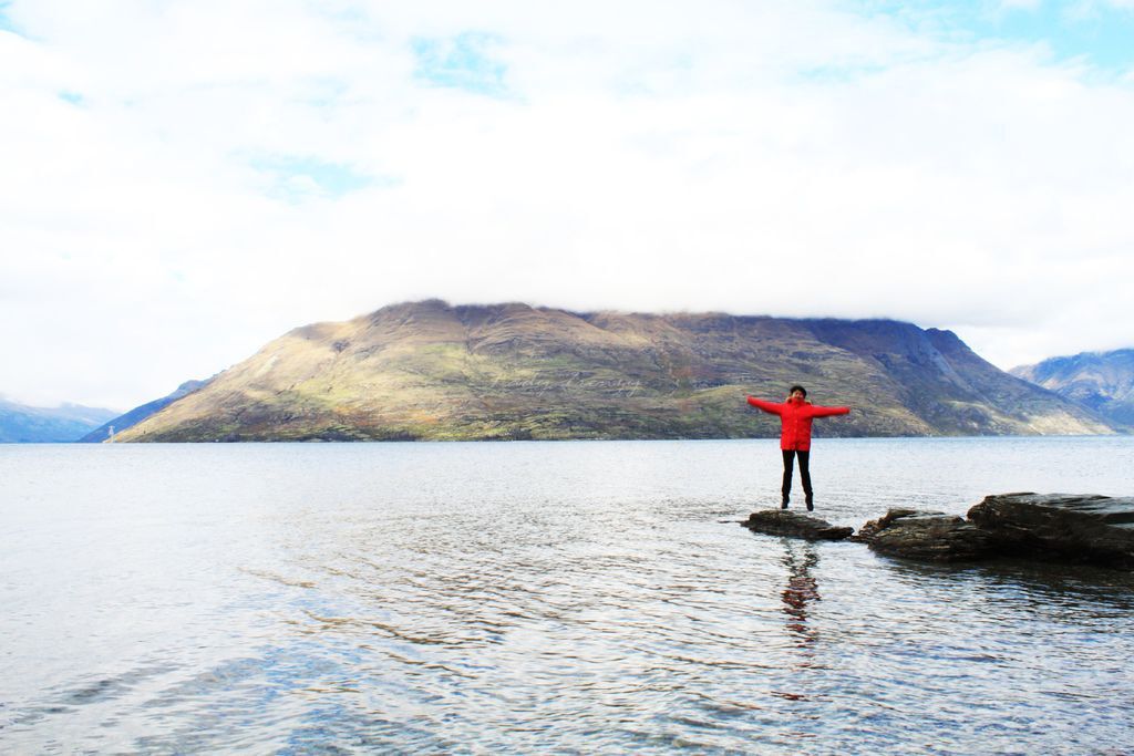 岸邊延伸出一些”走道”,看了腳就很癢,想也知道站在最末端的那顆石頭上、會有如站在水中央一樣的小小刺激(只要不摔下去的話),而且我也想從湖的角度看皇后鎮,馬上二話不說給走上去。就定位發現另一個走道也站了人在照相,我們英雄所見略同阿:P